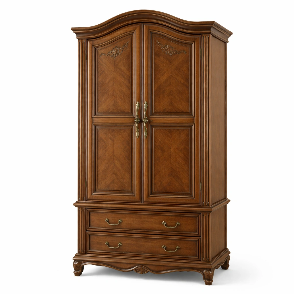 Armario construido en madera de nogal con acabado barnizado. El mueble incluye dos puertas y dos cajones, diseñado para almacenamiento de ropa y objetos personales.
